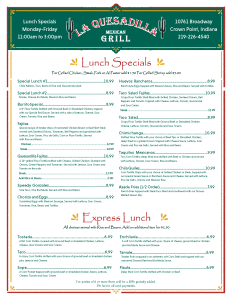 After serving delicious Mexican food to Northwest Indiana for 10 years, La Quesadilla branched out in June of 2016 and opened a new location in Crown Point, Indiana. Our Crown Point restaurant offers the same quality food, friendly service, daily specials as well as some outdoor seating and drive-thru service. Stop in today and experience the flavors of Mexico at either of our two convenient Northwest Indiana restaurants, you’ll be thoroughly pleased with your decision. Be sure to follow us on Facebook for contests, specials and coupons.